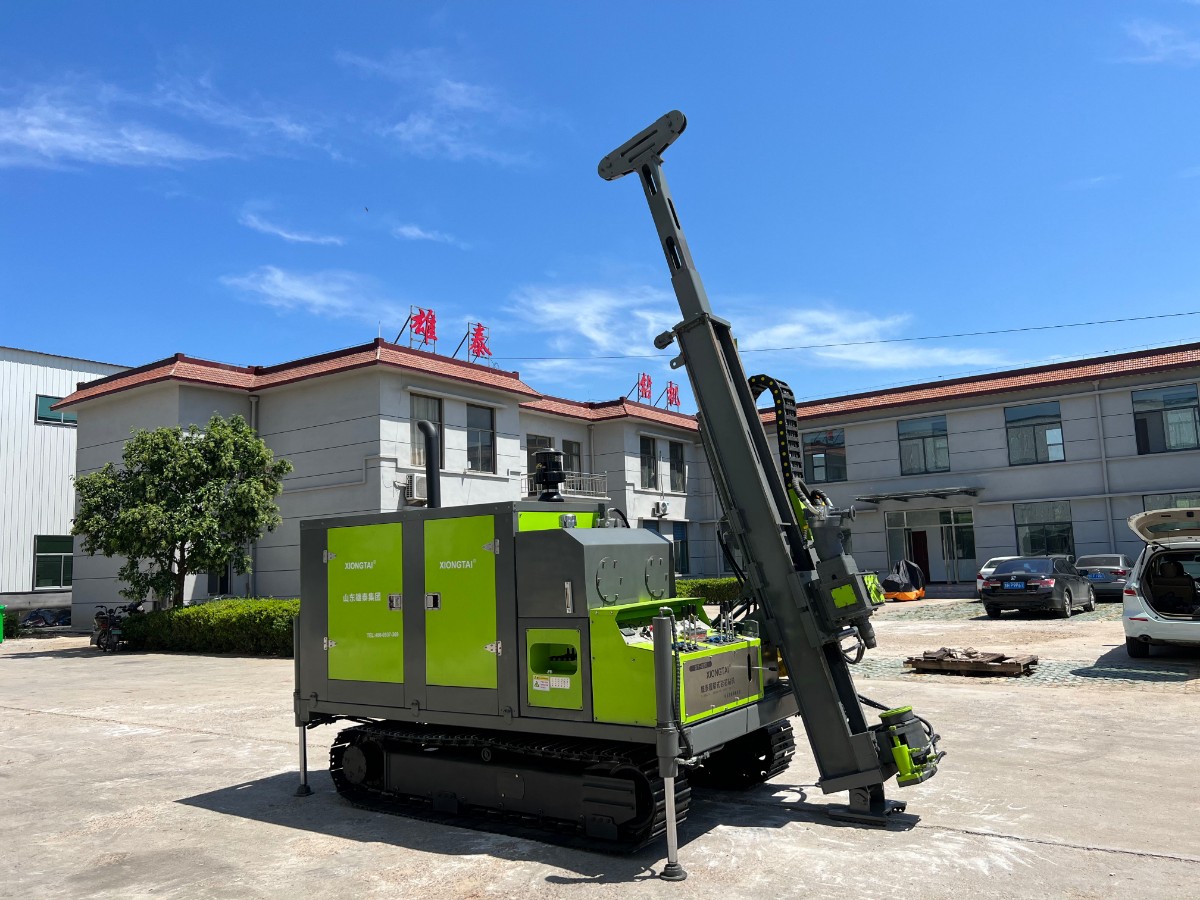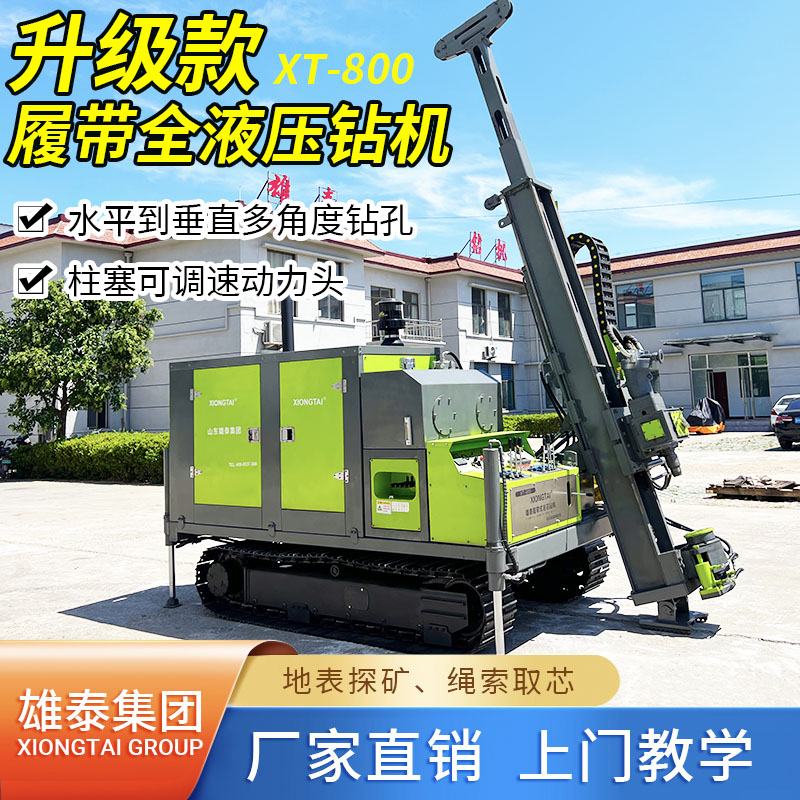 山東雄泰集團自主研發(fā)生產(chǎn)的履帶式全液壓鉆機的無線遙控行走、液壓桅桿自動升起,動力頭自動左側(cè)移機提鉆為該款鉆機一大特色。其中桅桿自動升起,動力頭移機為我公司實用新型專利,極大緩解了現(xiàn)場施工的難度,有效減小了鉆機施工人數(shù),節(jié)約了成本,該履帶式全液壓鉆機分別采用76KW/115KW發(fā)動機,動力強勁,扭矩大,適用于各類復雜地層的金屬礦開采。